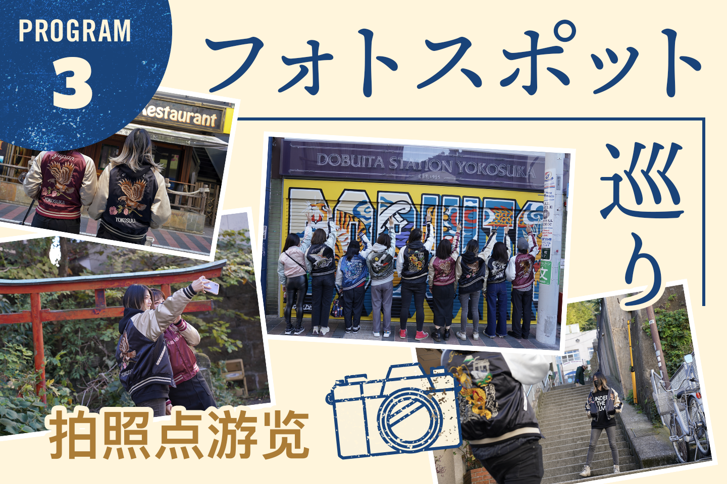 スカジャンの街横須賀ドブ板通りはスカジャンフォトスポットとしても人気です。本体験はスカジャンフォトの専門家によるレクチャーの元、スカジャンを着てフォトスポットで写真撮影をすることで街の魅力を感じていただくプログラムです。